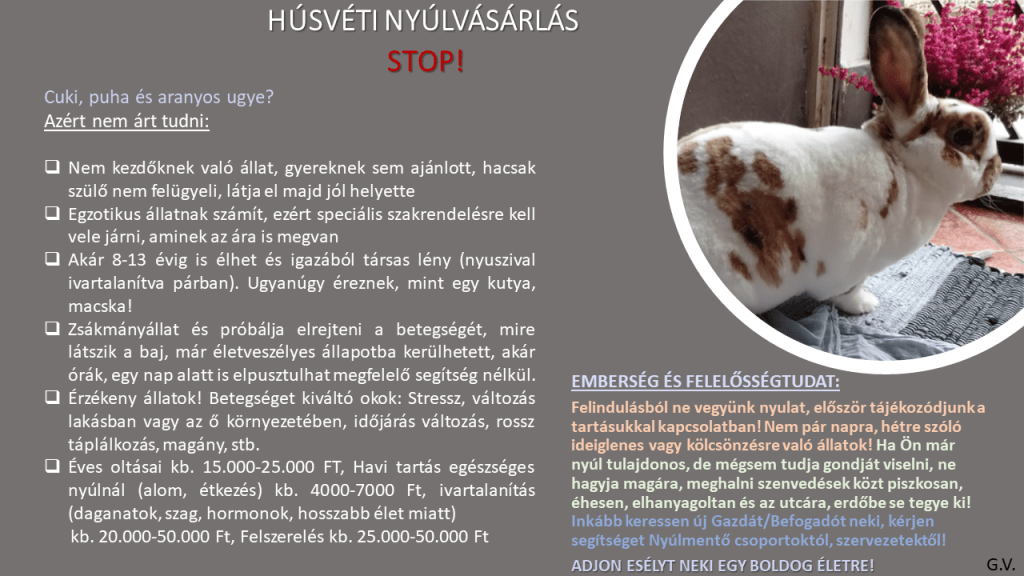 A boltokban, vásárokban kb. csak szaporítók adnak el állatot, szóval orosz rulett kit, mit visz haza az ember és mivel őket támogatjátok, emiatt új nyuszit visznek megint majd eladni! Kereslet = Kínálat! Ezt a nem átlátható, nem feltétlen felügyelt és sokszor csak haszonra fókuszáló, szaporítós gépezetet, pedig sajnos a leendő gazdik tartják olajozottan és életben! Illetve rossz példát mutatunk embereknek, a gyerekeknek és azt hihetik a nyusziknak ez nem okoz stresszt, nem pusztulhatnak bele egy kis ünnepi, családi “mókába”!